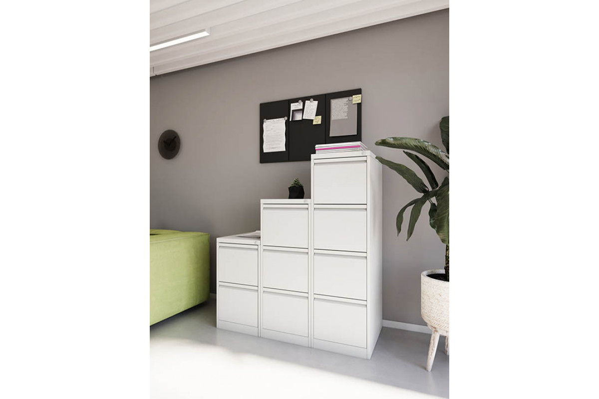 Шкаф оснащён тремя выдвижными ящиками, установленными на шариковых направляющих полного выдвижения, что обеспечивает плавное, бесшумное и полное открывание каждого ящика. Такая конструкция позволяет использовать всё внутреннее пространство и быстро находить нужные документы. Каждый ящик выдерживает нагрузку до 30 кг, подходит для папок формата A4 и Foolscap, а встроенная планка-держатель помогает организовать внутреннее пространство максимально упорядоченно.