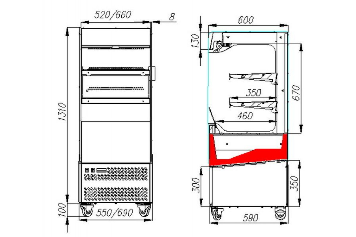 - Колесные опоры h-100 мм, что обеспечивает мобильность витрины;