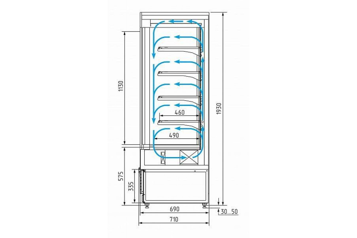 - Глубина выкладки полок 460 мм + основание горки с глубиной 490 мм;