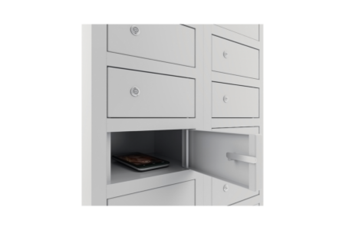 размер отдельной ячейки 97х199х170 мм. (полезная площадь), габариты одной ячейки позволяют свободно уместить до 8 мобильных телефонов.