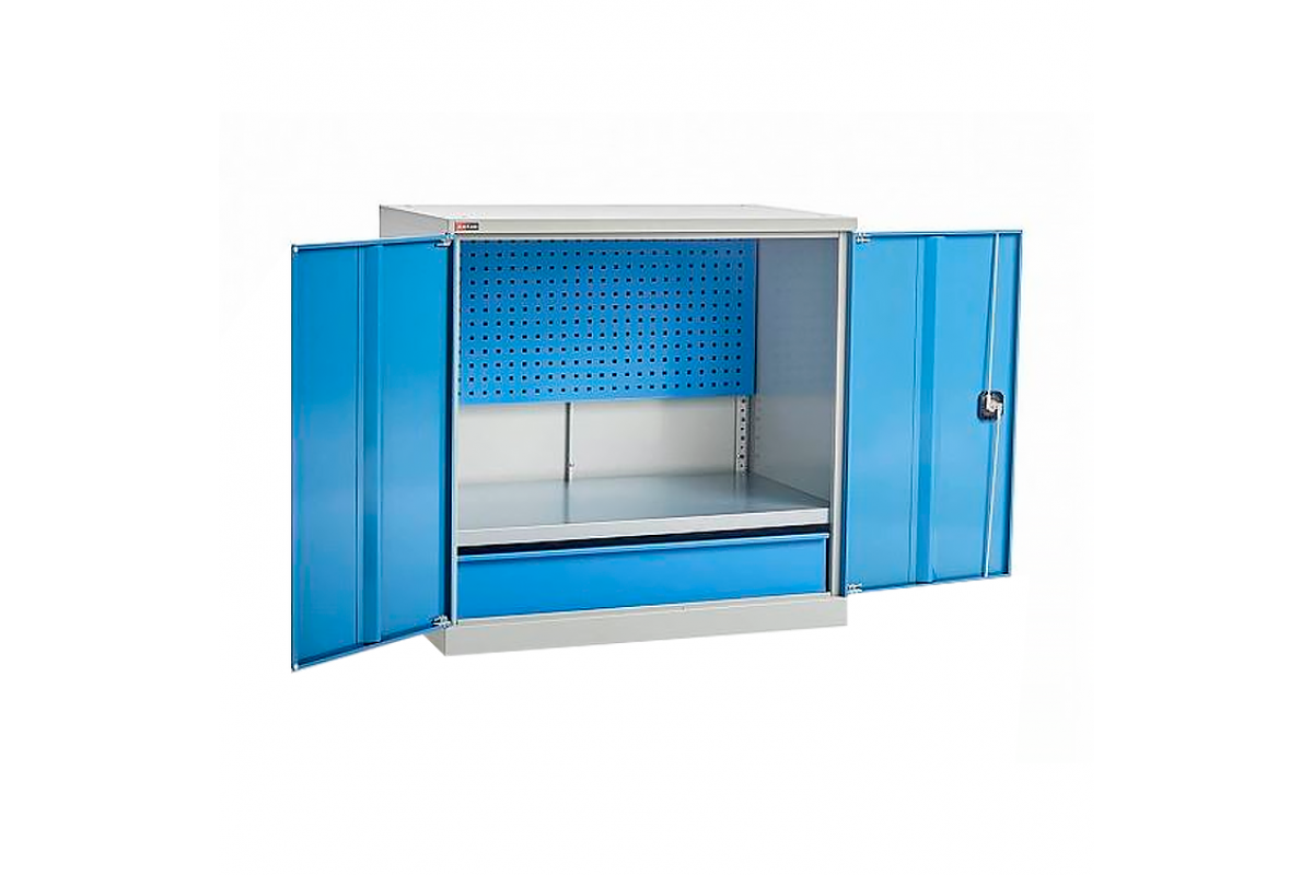 корпус, аксессуары — серый RAL 7038, дверцы, ящики и экраны — синий RAL 5012