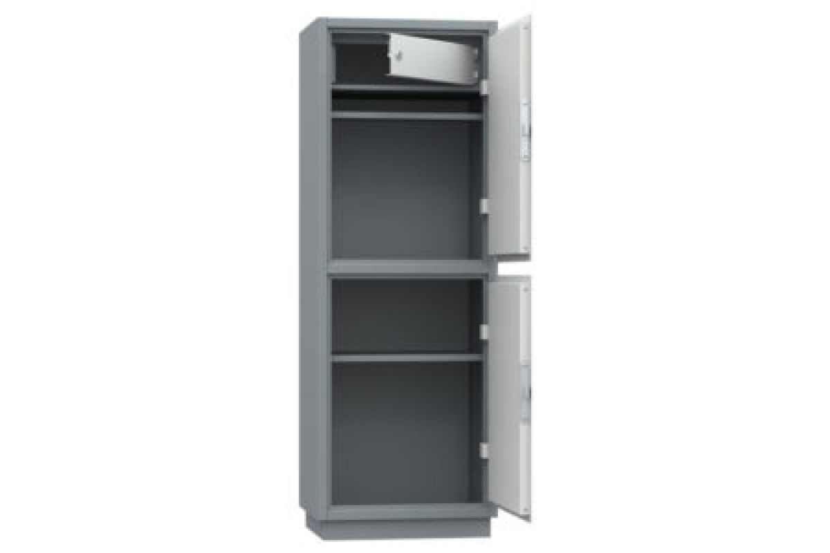 Многосекционный бухгалтерский шкаф позволяет хранить документы в отдельных секциях. Каждая секция запирается на индивидуальный ключ, таким образом, одним шкафом могут пользоваться сразу несколько человек. Наример, верхнюю секцию может использовать бухгалтер, нижние — менеджеры.