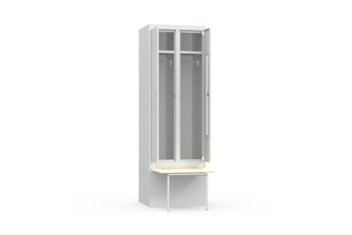 Шкаф металлический для одежды серии ШР-22 L600 ОСК с откидной скамьей предназначен для хранения одежды в офисных и подсобных помещениях, общественных и государственных учреждениях, спортивных раздевалках.