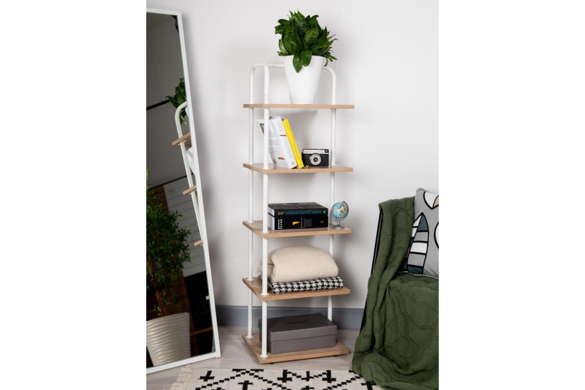 Стеллаж Отрада узкий с 5 полками из ЛДСП, 400х330х1260Н, белый/дуб