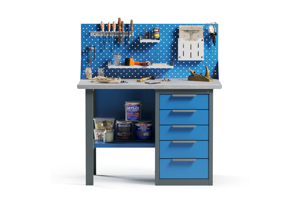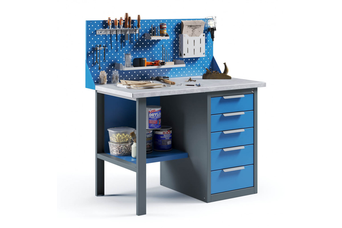- Верстак укомплектован драйвером с пятью выдвижными ящиками разными по высоте и тумбой с полками.
