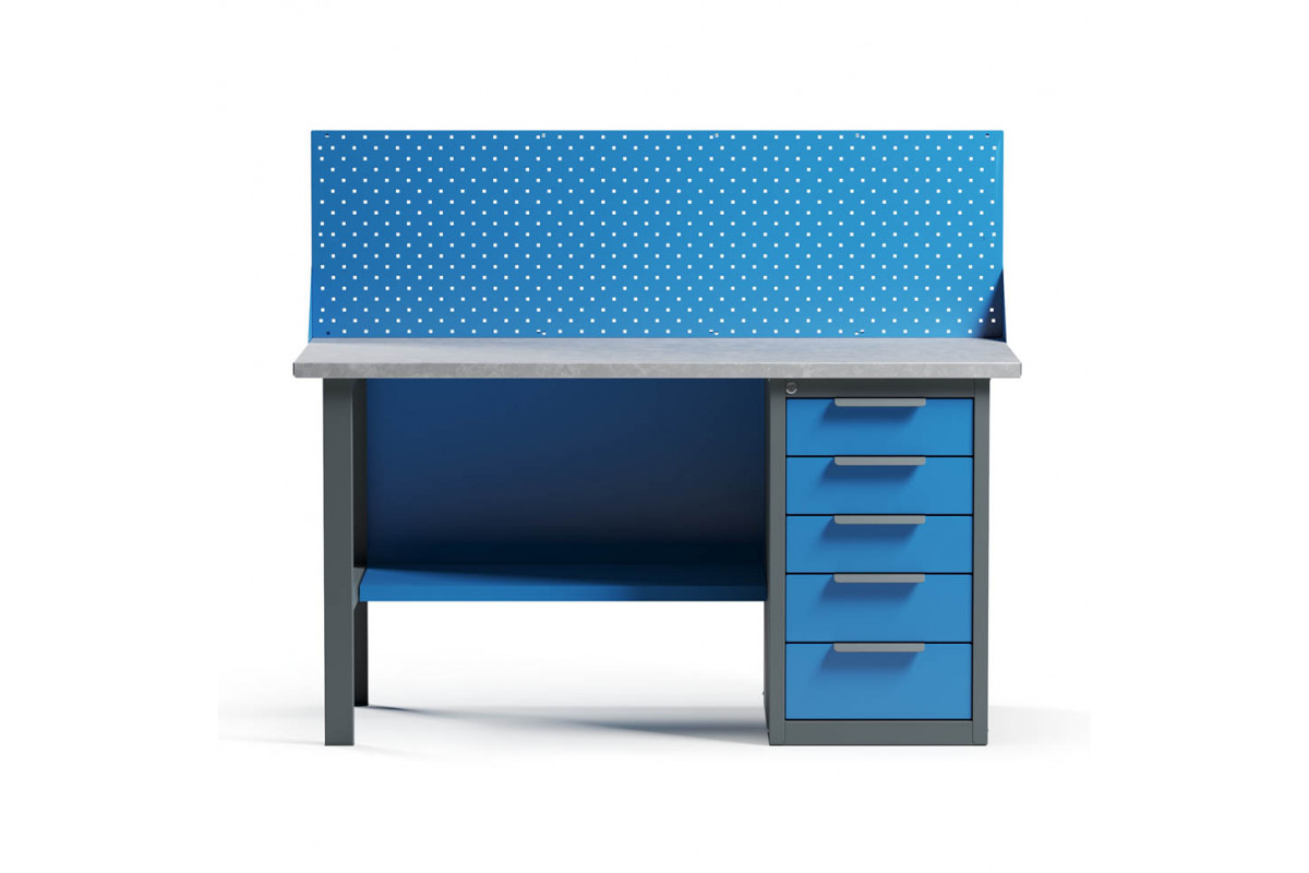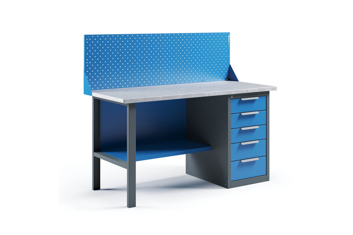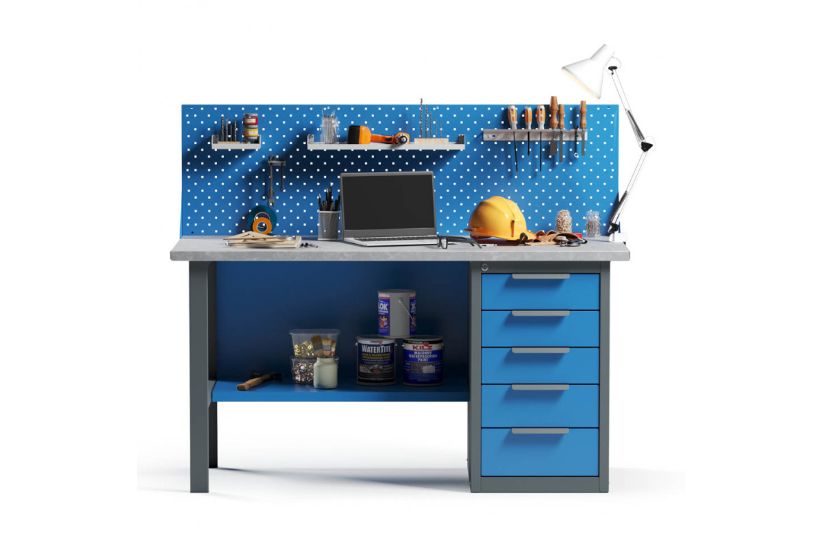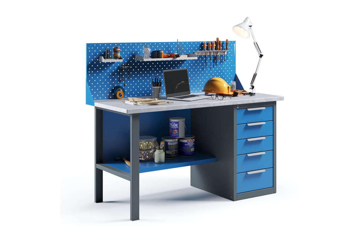 - Верстак укомплектован драйвером с пятью выдвижными ящиками разными по высоте и тумбой с полками.