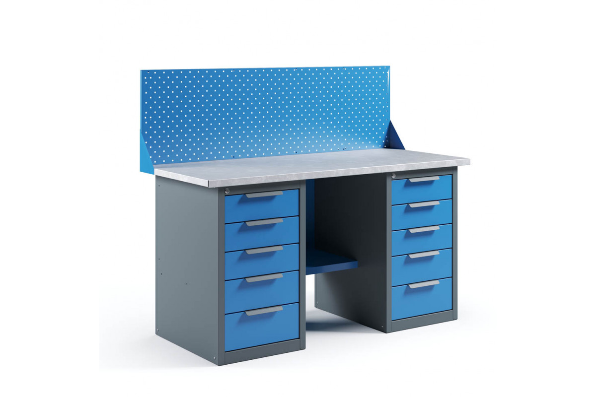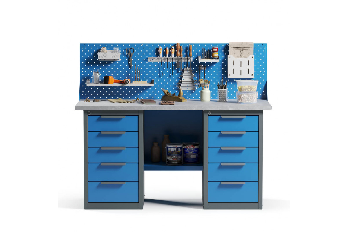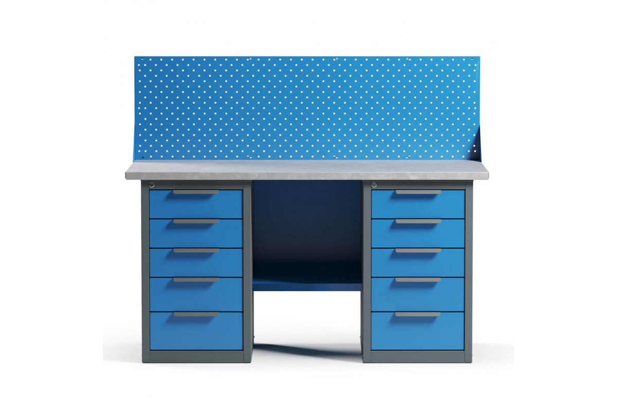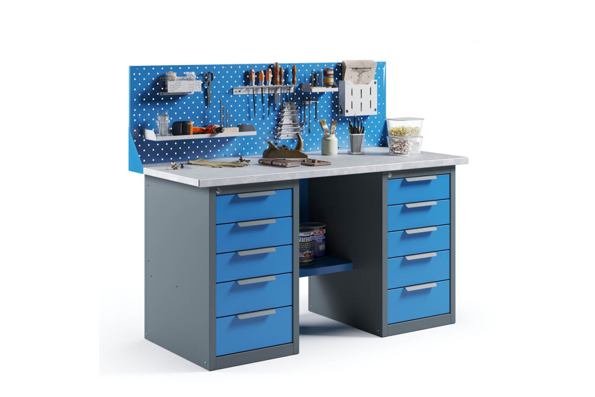 - Верстак укомплектован двумя драйверами, каждый из которых оснащен пятью выдвижными ящиками разными по высоте.