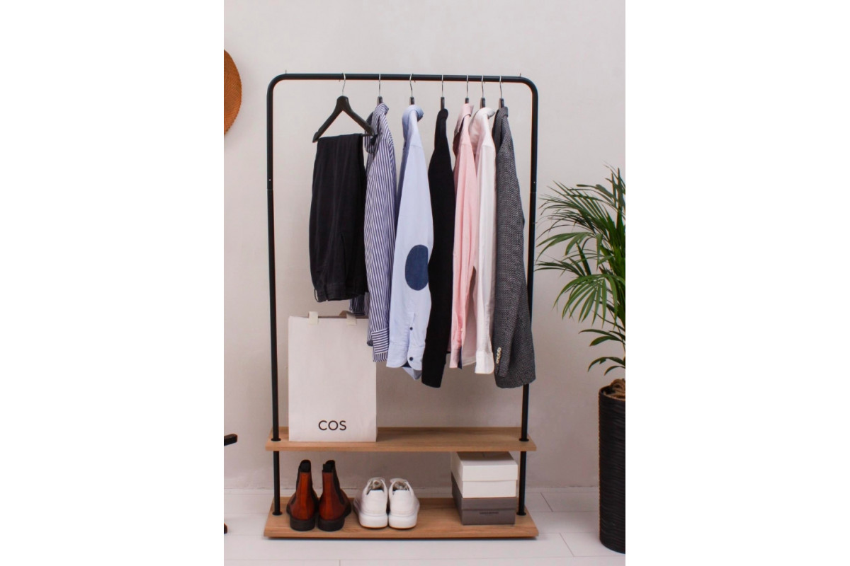 Вешалка напольная Отрада с полкой для обуви из ЛДСП, 910х330х1500Н, черная/дуб