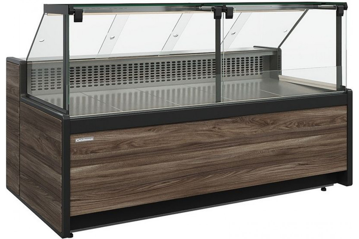 - Экспозиционная поверхность и столешница изготовлены из шлифованной нержавеющей стали, декоративная фронтальная панель – из МДФ;