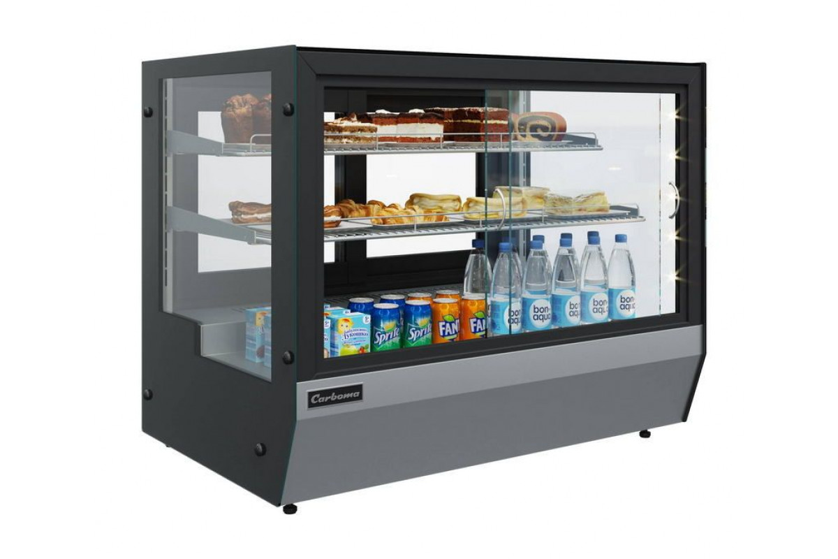 Витрина холодильная настольная Carboma AC59 VM 1,2-1 (слайдер, 0430) компактная, мобильная витрина идеальна для небольших кафе, баров с большой проходимостью, когда требуется снизить нагрузку обслуживающего персонала. Витрина оснащена раздвижными створками-слайдерами с двух сторон - со стороны покупателя для самообслуживания и со стороны продавца - для удобства загрузки товара. Современный, стильный кубический дизайн. Стабильный температурный режим, благодаря динамическому охлаждению и наличию стеклопакетов.