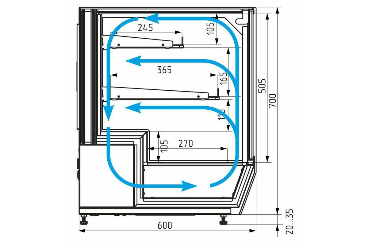- Глубина выкладки 270 мм + 2 полки: 365 мм и 245 мм;
