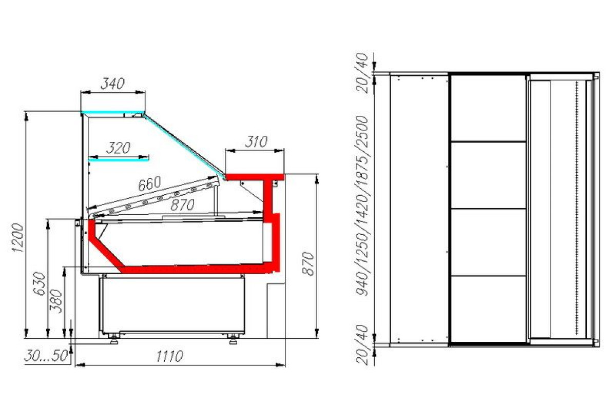 - столешница по длине витрины с нержавеющей стальной поверхностью шириной 260 мм.