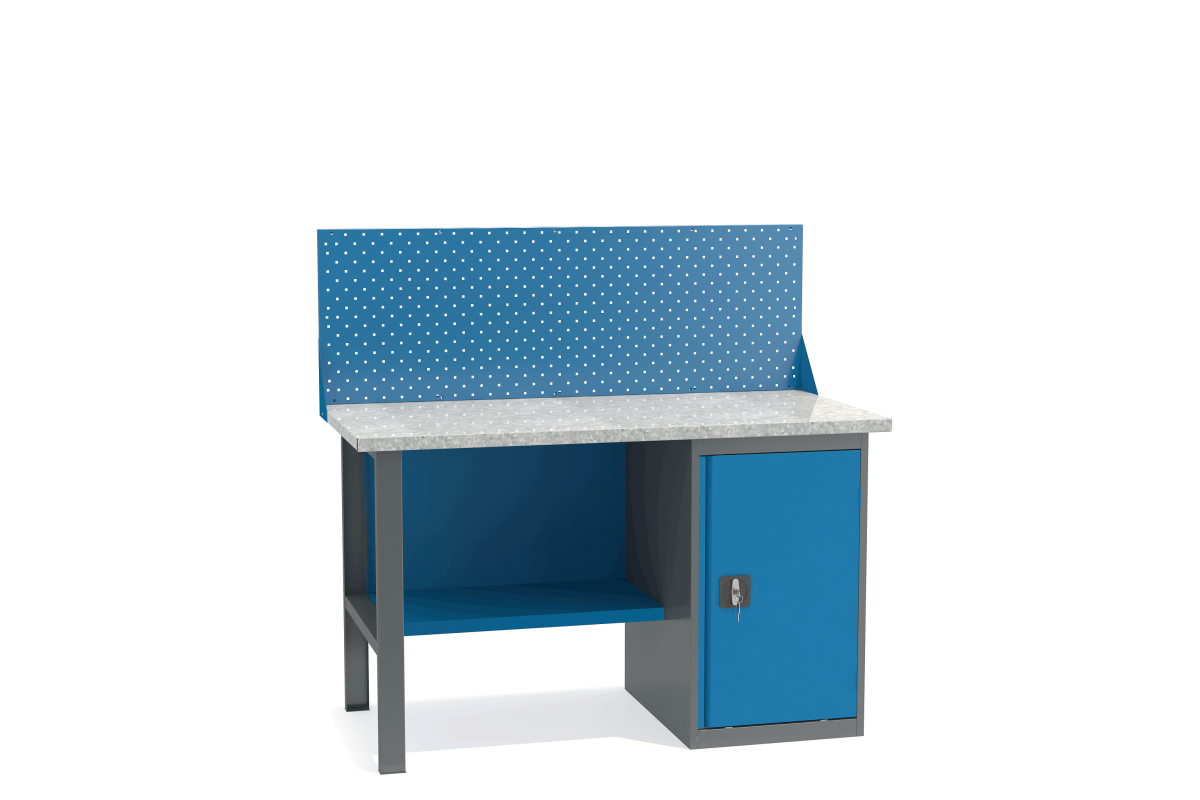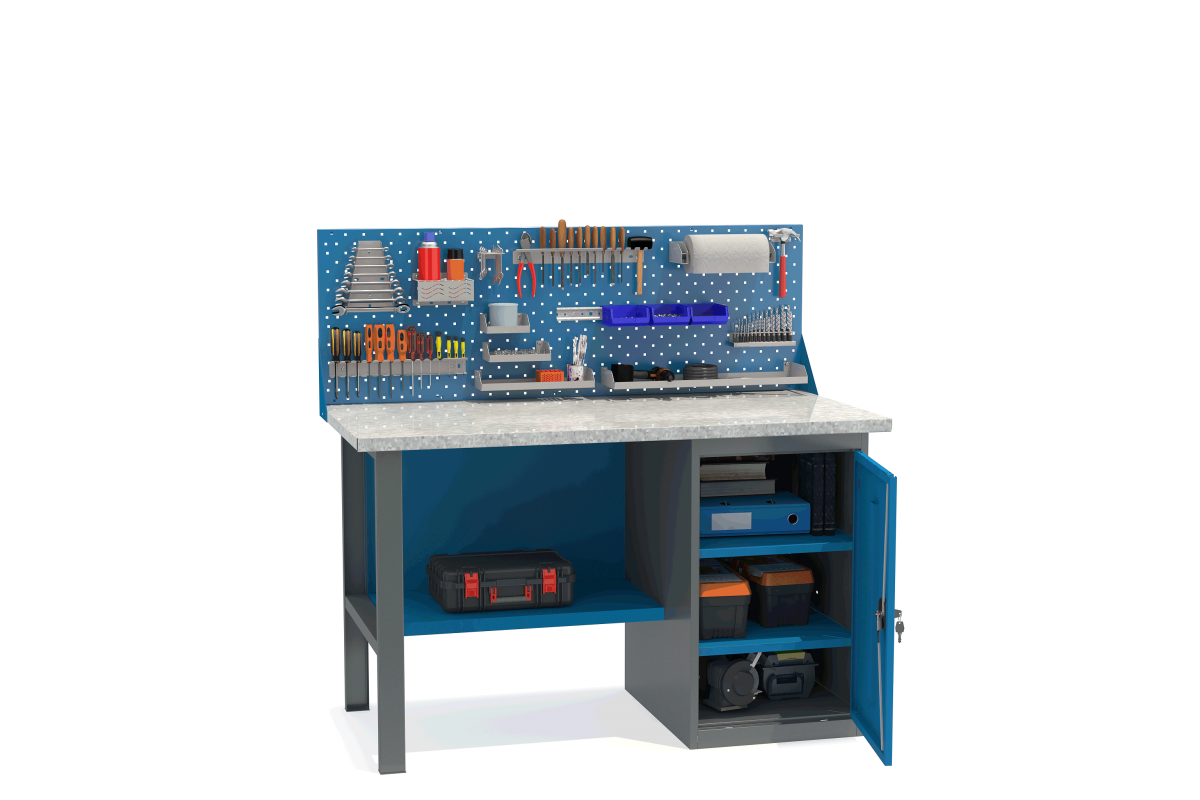 - Верстак имеет надежную модульную конструкцию с усиленной столешницей (плита МДФ 25мм, покрытая листом оцинкованного металла).