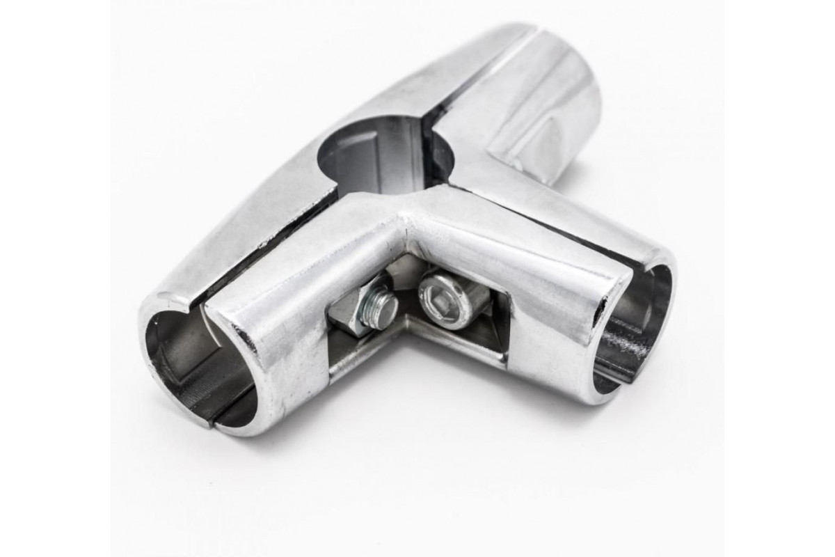 Зажим для труб в 5-ти направлениях d=25мм, хром, соединяет 4 трубы, одна из труб по центру проходит насквозь, а 3 другие перпендикулярно от сквозной. Используется для создания разнообразных витрин, стоек, перегородок, примерочных кабин. Характеристика: