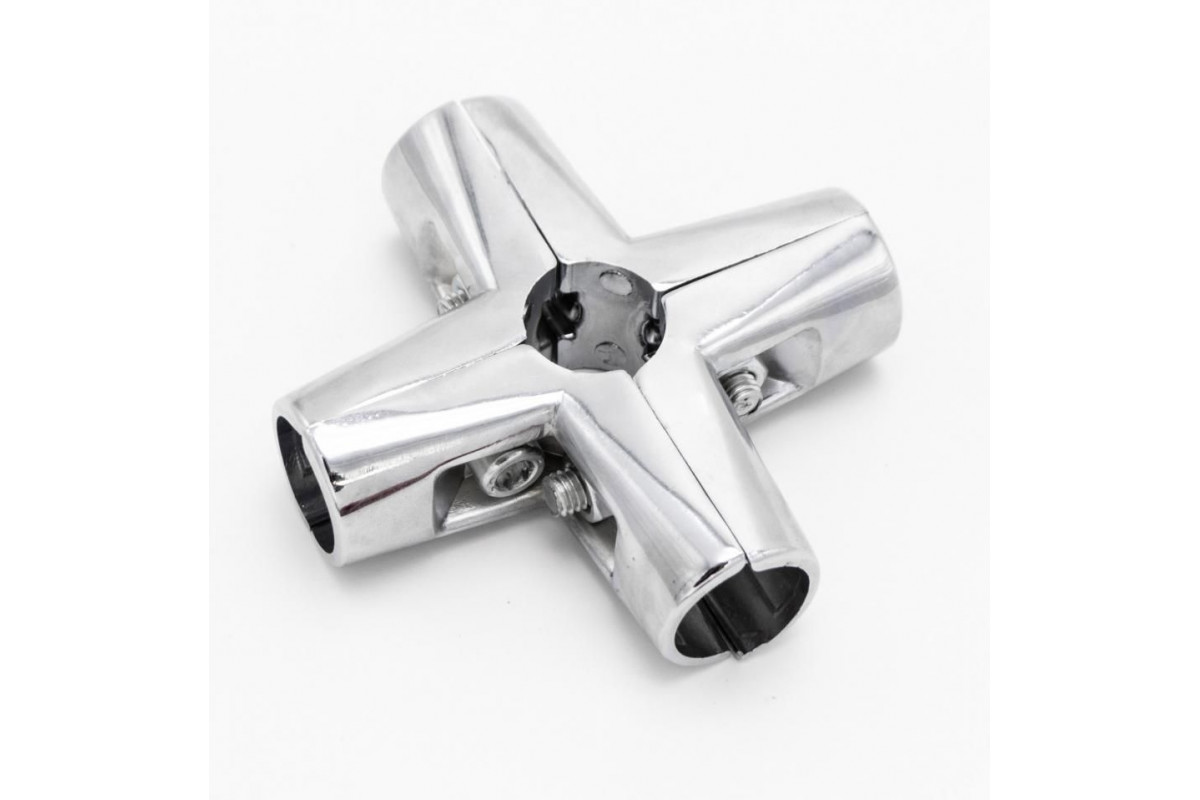Зажим крестообразный для труб в 6-ти направлениях d=25мм, хром, соединяет 5 труб, одна из которых по центру проходит насквозь, а 4 другие перпендикулярно от сквозной. Крепеж позволяет экономить на кол-ве крепежей, задействованных при сборке, так как од